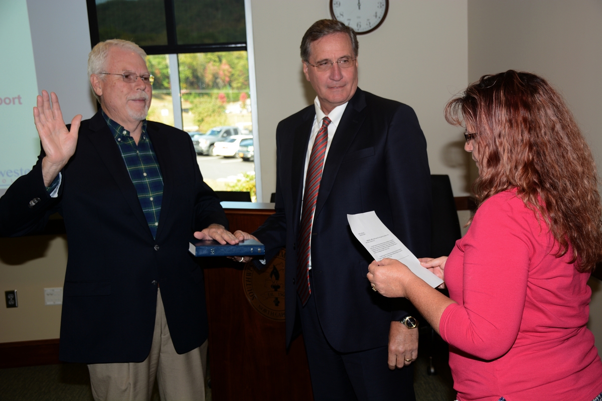 | Doug Cody (left) is sworn in as a member of Southwestern Community College’s board of trustees on Oct. 10 at the Jackson Campus. He’s pictured with Dr. Don Tomas (center), president of SCC, and Kelly Rich, assistant clerk of court in Jackson County. |