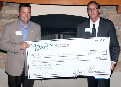 Representing Macon Bank, chief operating officer Ryan Scaggs (left) presented Dr. Don Tomas, Southwestern Community College president, with a check for $33,333.33 Tuesday night at SCC’s Macon Campus. The donation was the largest yet to the SCC Foundation’s Student Success Campaign, which aims to bridge the gap between scholarship need and availability. |