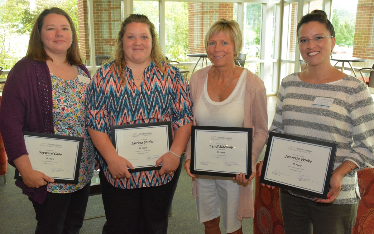 | SCC employees honored for 10 years of service to the state of North Carolina included, from left: Sayward Cabe, Financial Aid Assistant Director; Latresa Downs, Workforce Continuing Education Administrative Assistant; Cyndi Slocumb, Networking Instructor; and Jeanette White, Civil Engineering Technology Instructor. Not pictured is Cheryl Renfro, Upward Bound Academic Advisor. |