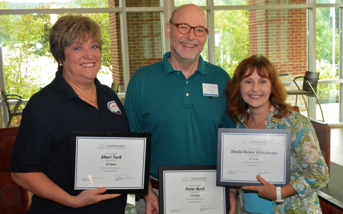 | SCC employees honored for 15 years of service to the state of North Carolina included, from left: Sheri Turk, Occupational Education Program Coordinator & Early Childhood Instructor; Peter Buck, Student Counselor; and Renea Winchester, College Information Center Coordinator. Not pictured are Mitch Boudrot, Law Enforcement Training Program Director/Coordinator/Instructor; and Lois Greene, Cleaning Technician. |