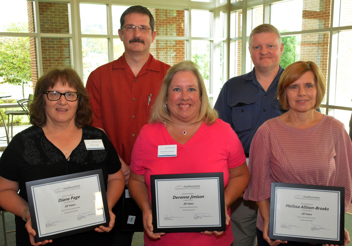 | SCC employees honored for 20 years of service to the state of North Carolina included, from left: Dr. Diane Page, Physical Therapist Assistant Program Coordinator; Michael Deaver, Computer Engineering Technology Program Coordinator & Electronics Engineering Technology Instructor; Devonne Jimison, Coordinator of High School Equivalency Testing/Literacy Instructor; Todd Moses, HVAC Mechanic; and Melissa Allison-Brooks, Medical Assisting Program Coordinator. |