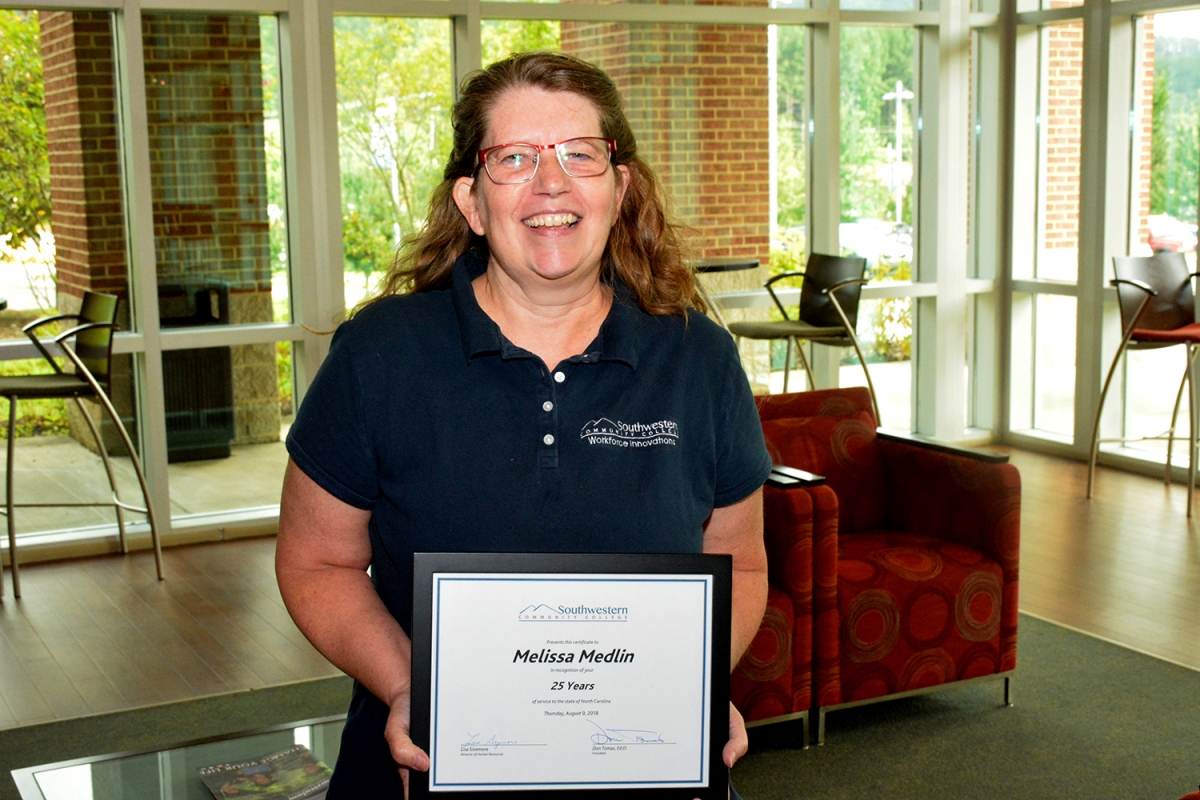 | Melissa Medlin, who serves as Workforce Continuing Education Registrar at Southwestern Community College, was honored for 25 years of service to the state of North Carolina during SCC’s Welcome Back festivities on Aug. 9 at the college’s Jackson Campus in Sylva. Not pictured is Curtis Dowdle, Dean of Public Safety Training. |