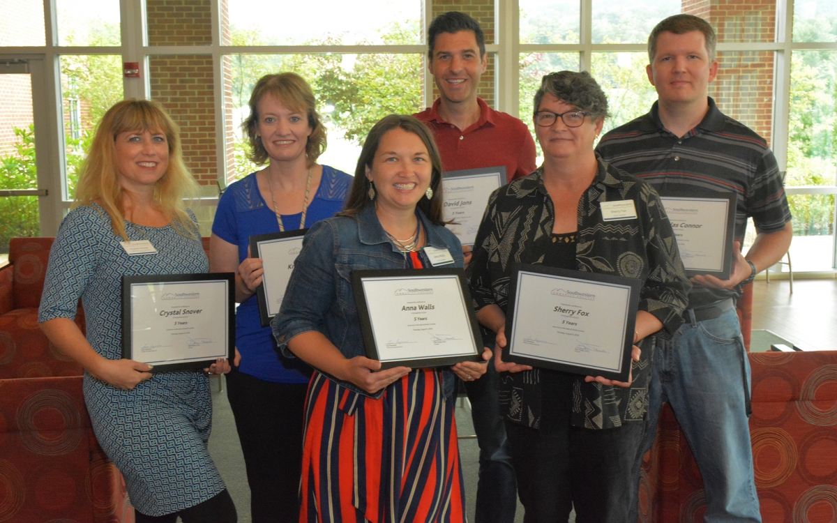 | Southwestern Community College employees were recognized for their years of service to the state of North Carolina during the college’s Welcome Back festivities on Aug. 9 at the Jackson Campus in Sylva. Honored for five years of service are, from left: Crystal Snover, College and Career Readiness Coordinator; Kristyn Stevens, Nursing Instructor; Anna Walls, Occupational Therapy Assistant Program Coordinator; David Jons, Spanish Instructor; Sherry Fox, Library Assistant; and Nick Connor, Systems Administrator. Not pictured are Hunter Braswell, Automotive Systems Technology Instructor; and Cheyenne Shuler, Cleaning Technician. |
