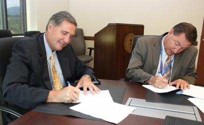 Dr. Don Tomas (left), Southwestern Community College president; and Dr. Michael Murray, superintendent of Jackson County Public Schools, signed a memorandum of understanding that will maintain their current level of cooperation on the Jackson County Early College. |