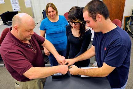 | Tim Coffey (left), coordinator for SCC’s criminal justice and latent evidence programs, shows students the proper technique for recording a legible fingerprint. Pictured with Coffey are, from left: Debbie Payne Smith of Waynesville, Felicia Guy of Sylva and Matt Sims-Bilcliffe of Hickory. |