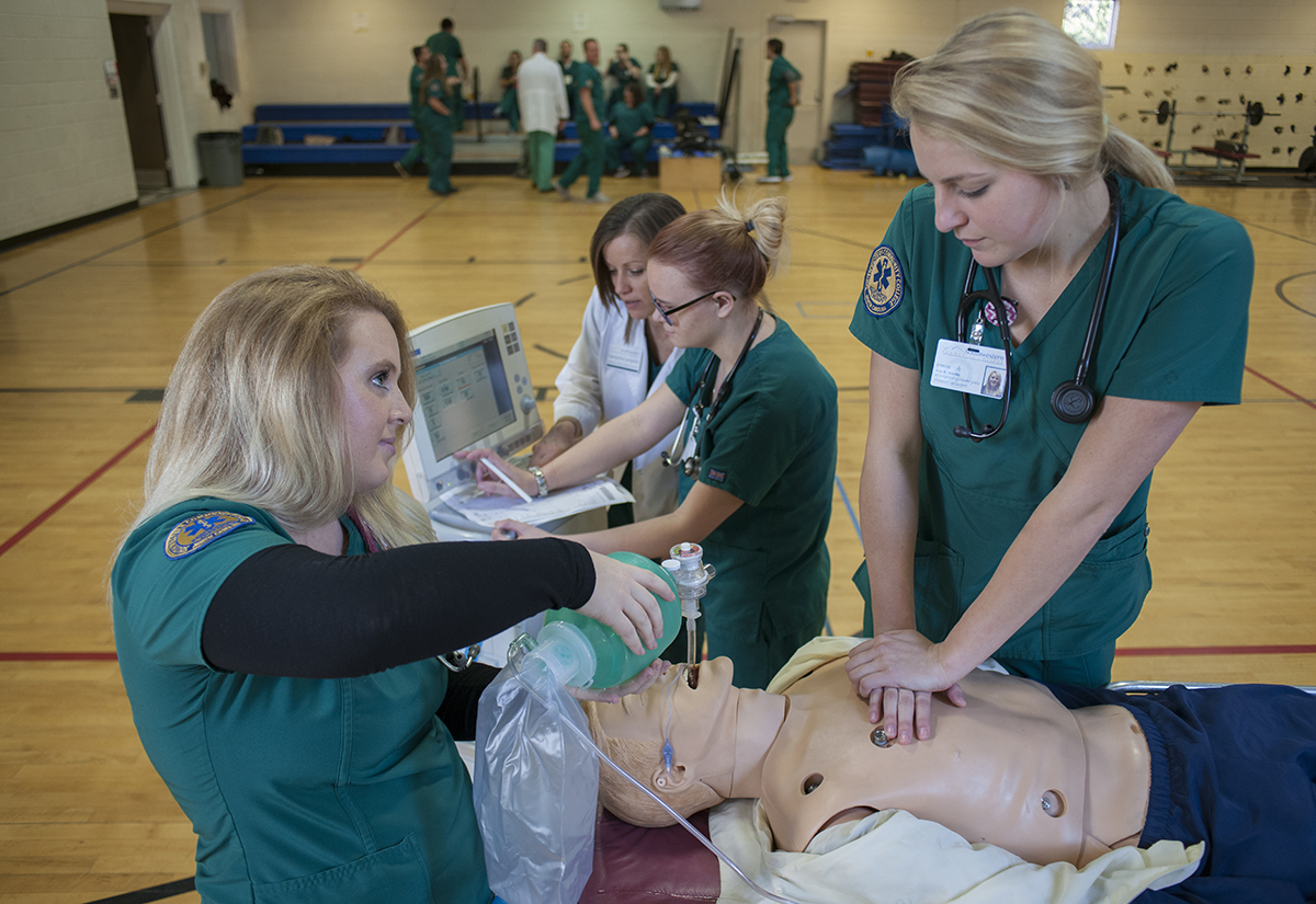 | Natalie Kerr (left) and Morgan Henry, students from Franklin in SCC’s respiratory therapy program, work on a simulation mannequin earlier this year. The college and its public school partners have secured more than $1.77 million for STEM education, and SCC plans to use its portion to outfit its new health sciences simulation lab with state-of-the art simulation mannequins and related equipment. |