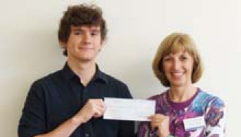Noah Miller (left), Macon Early College (MEC) student body president, presents a $125 check for Relay For Life to Doreen Castle, coordinator of business services at SCC’s Macon Campus. MEC’s