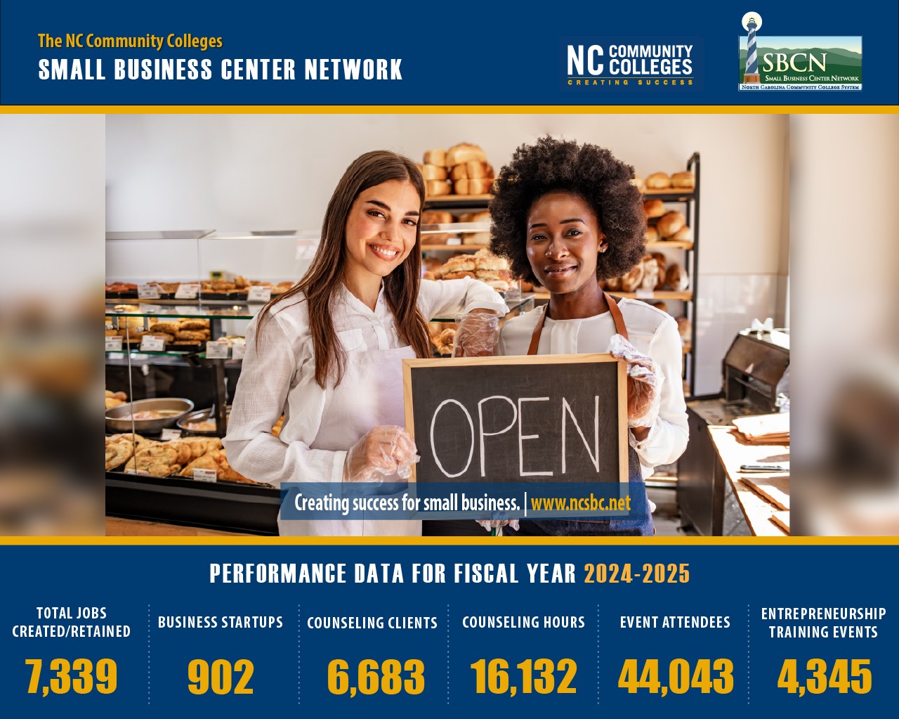 The North Carolina Community College's Small Business Center Network (SBCN) is our state's largest small business assistance initiative. It began in 1984 with 8 centers, and by 1995 there were 58 Small Business Centers (SBC's) across the state, one at each community college. The goal of the SBC's is to increase the number and success rate of small businesses by providing high-quality, accessible assistance to small business owners, which in turn leads to job creation and retention.